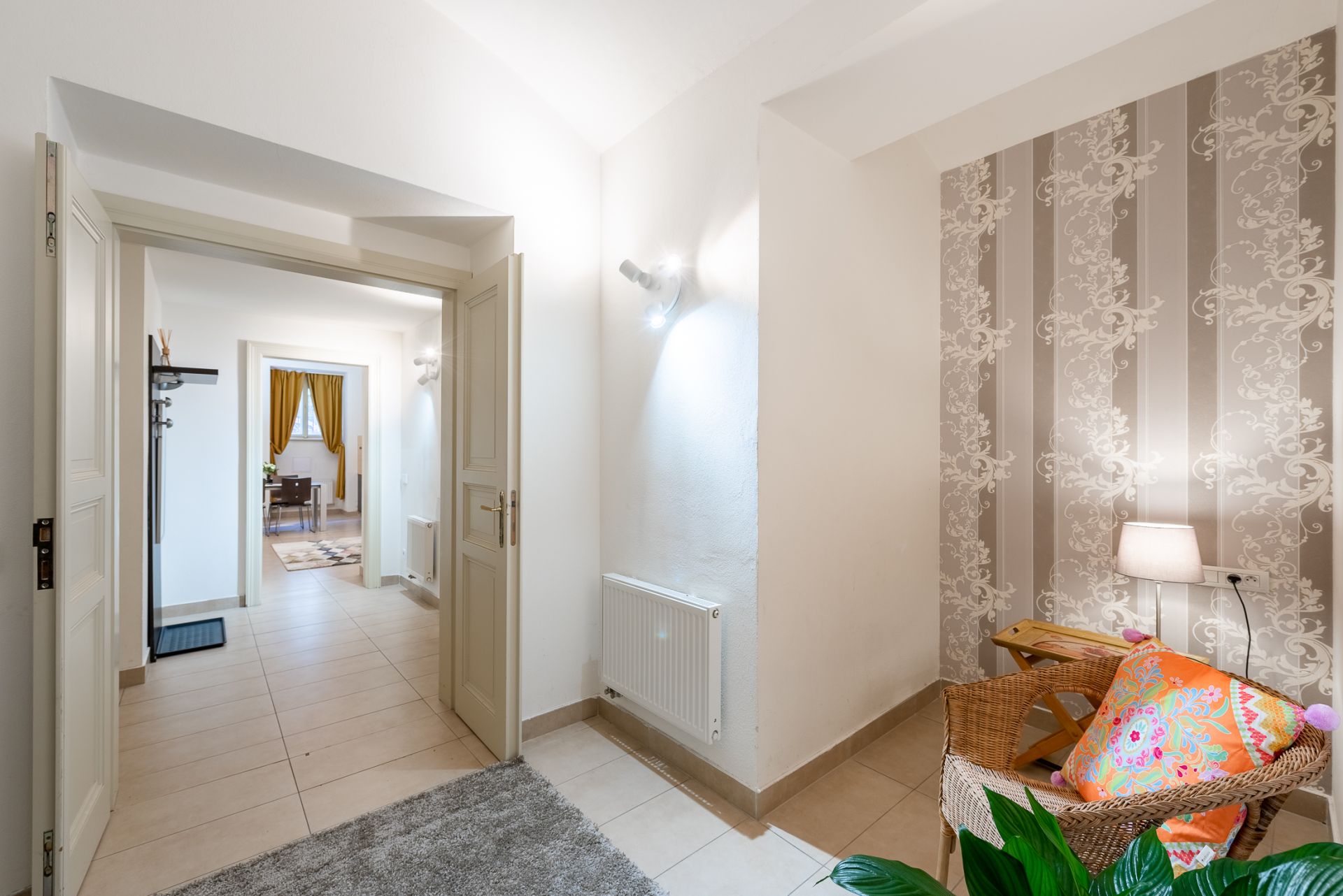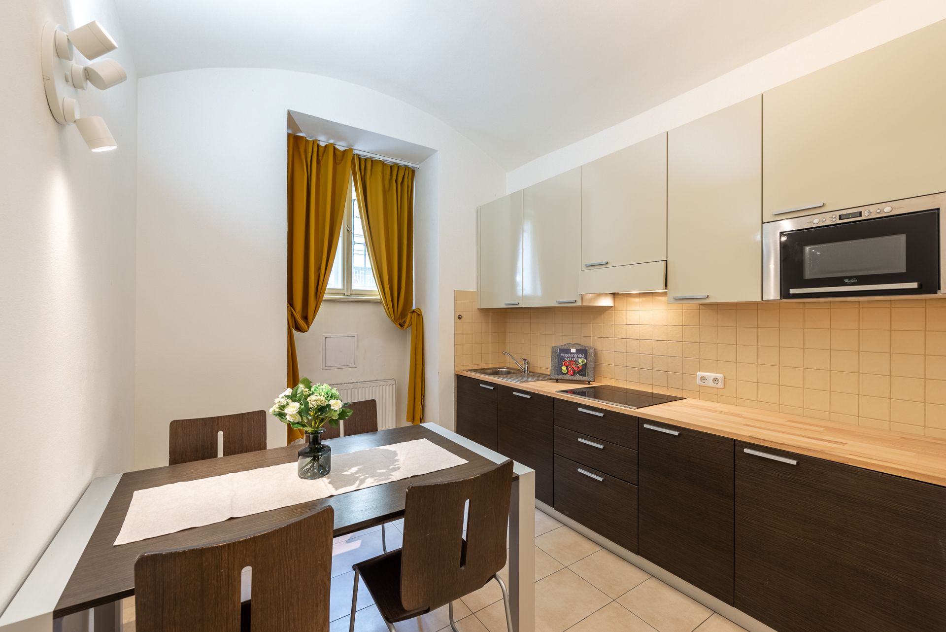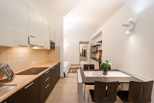 Z kuchyně a obývacího prostoru jsou okna orientována do ulice, ložnice je situována do klidného zeleného vnitrobloku, což zajišťuje příjemné soukromí i přes centrální polohu.
